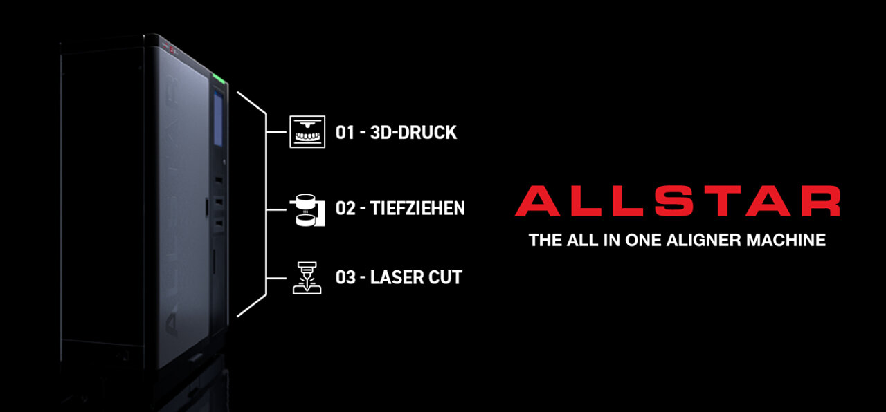 Der ALLSTAR ist eine vollautomatische Maschine zur Herstellung von Alignern und Retainern direkt im Labor oder in der Praxis – effizient, wirtschaftlich und unabhängig von Personalverfügbarkeiten.