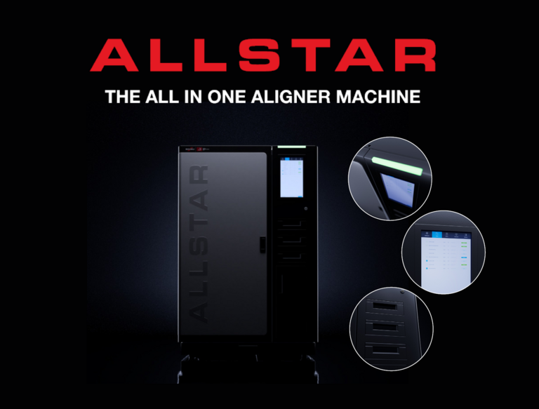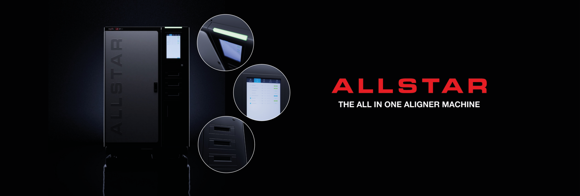 Der ALLSTAR ist für die Produktion von Alignern und Retainern optimiert. Die Kombination aus 3D-Druck, Tiefziehverfahren und Laserschneiden ermöglicht passgenaue Schienen ohne manuelle Nachbearbeitung