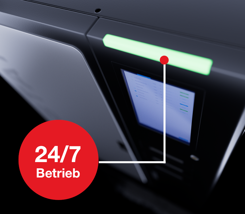 Ja, der ALLSTAR ist für den 24/7-Betrieb ausgelegt, auch nachts und am Wochenende. Der klimatisierte Folienraum sorgt für konstante Materialqualität, und die Mülleimerkapazität reicht für 96 Aligner, sodass ein kontinuierlicher Betrieb möglich ist